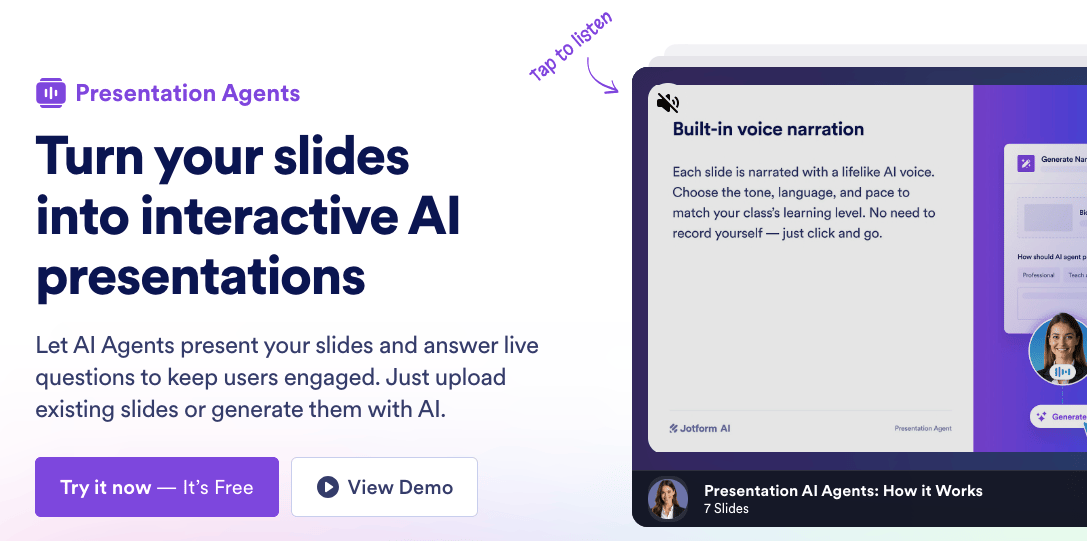 Generate a presentation from a simple prompt, or upload your own PDF, PPTX, or Google Slides. Presentation Agent turns it into an AI-powered, voice-narrated experience that answers questions in real time. Automate demos, onboarding, training, and more.