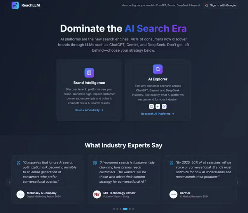 Community mAI search is the new front page. ReachLLM audits ChatGPT, Gemini & DeepSeek for your domain, surfaces AI-written brand blurbs, rivals, and high-intent prompts, then exports CSVs so you can practise Generative Engine Optimization and own the answer box.