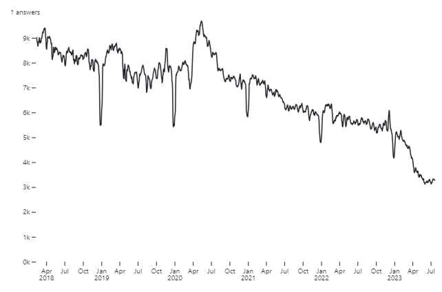 Stack Overflow has seen a 50% drop in traffic since the launch of ChatGPT and a 60% drop in the past 5 years. Many of its moderators went on strike due to the platform's allowing AI generated content.