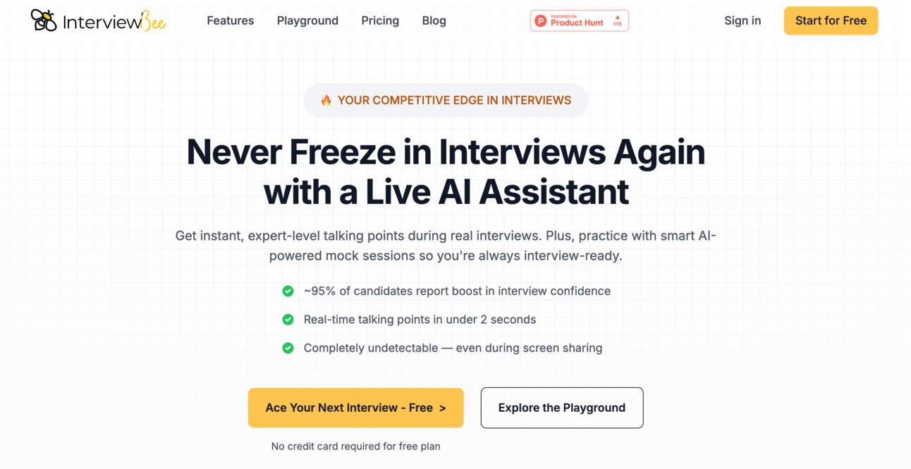 InterviewBee is your AI assistant that provides expert-level talking points in under 2 seconds during live interviews. 95% of users report significant confidence boosts, helping transform their interview anxiety into job offers.