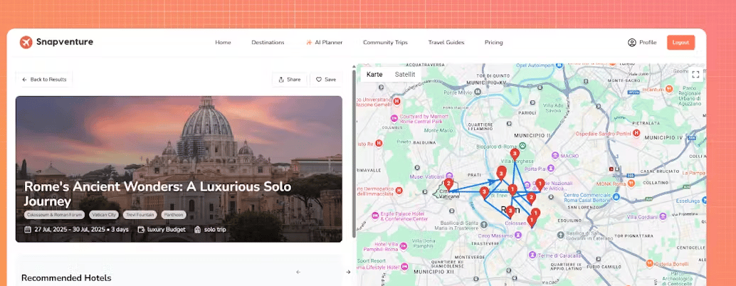 Flexible, Editable Schedules: Easily modify your day-by-day itinerary—regenerate days, swap activities, and fine-tune pace or budget.