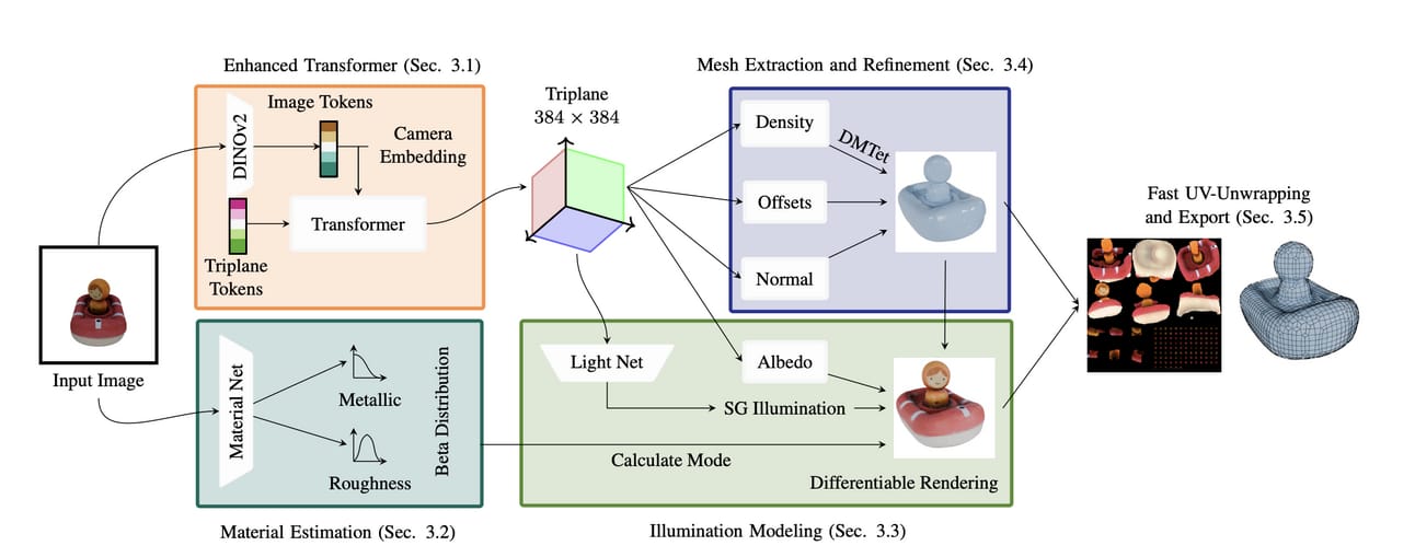 Moreover, SF3D mitigates "staircase artifacts" caused by the marching cube algorithm. It achieves smoother surfaces using a refined architecture and normal maps to store surface orientations for more detailed lighting effects. The system also predicts material properties like roughness and metallic qualities, enhancing the realism of light reflections under different conditions. With an advanced neural network and efficient pipeline, SF3D generates high-quality 3D models under 1 MB in just 0.5 seconds, and can create models from text descriptions in about one second.