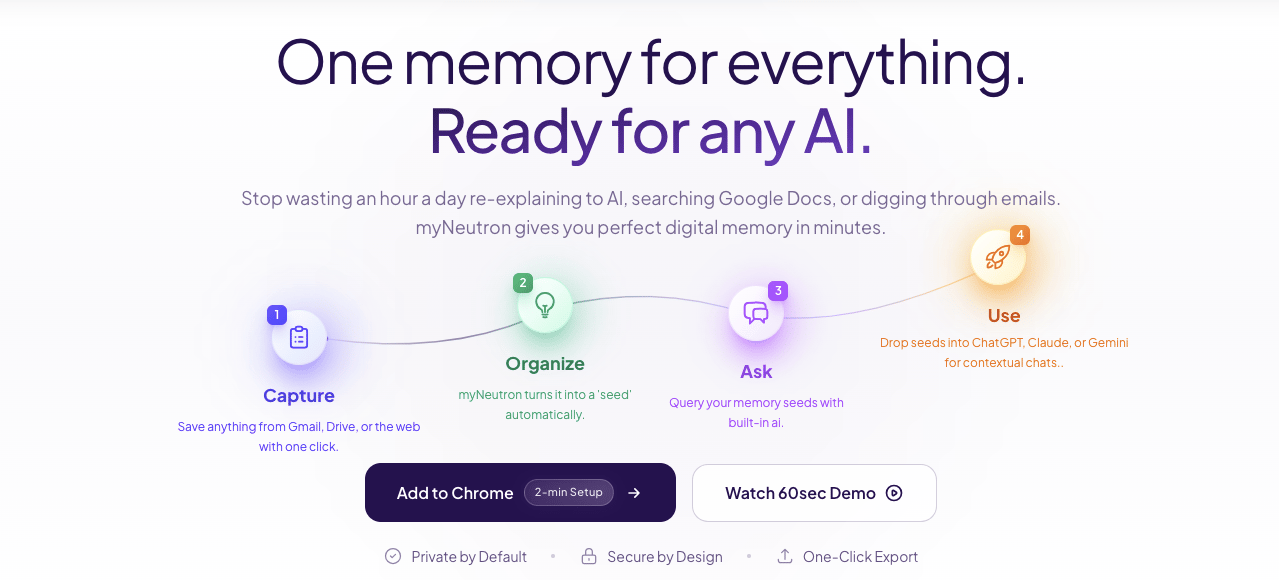 Capture pages with the Chrome extension; optionally auto-save Gmail & Drive into small context packets called Seeds